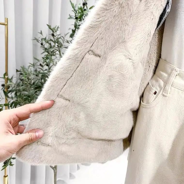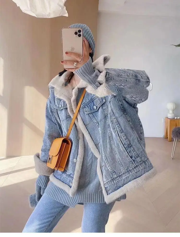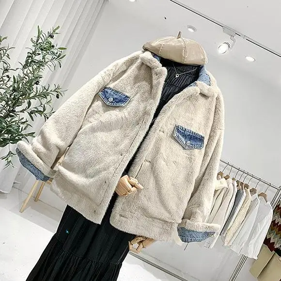 Chaqueta vaquera de lana de cordero de doble cara para mujer, abrigo holgado informal acolchado de terciopelo grueso y peludo para vaqueras de invierno