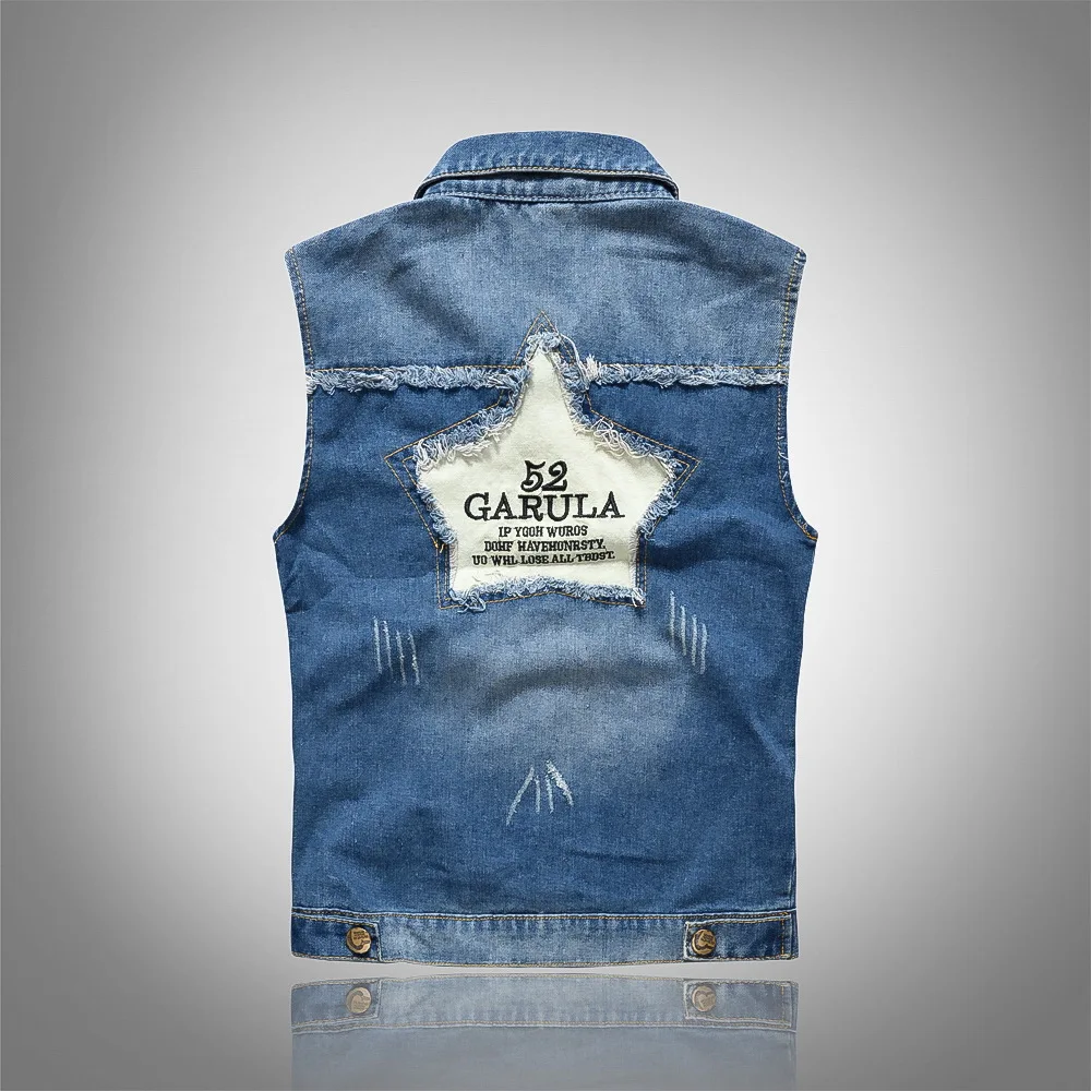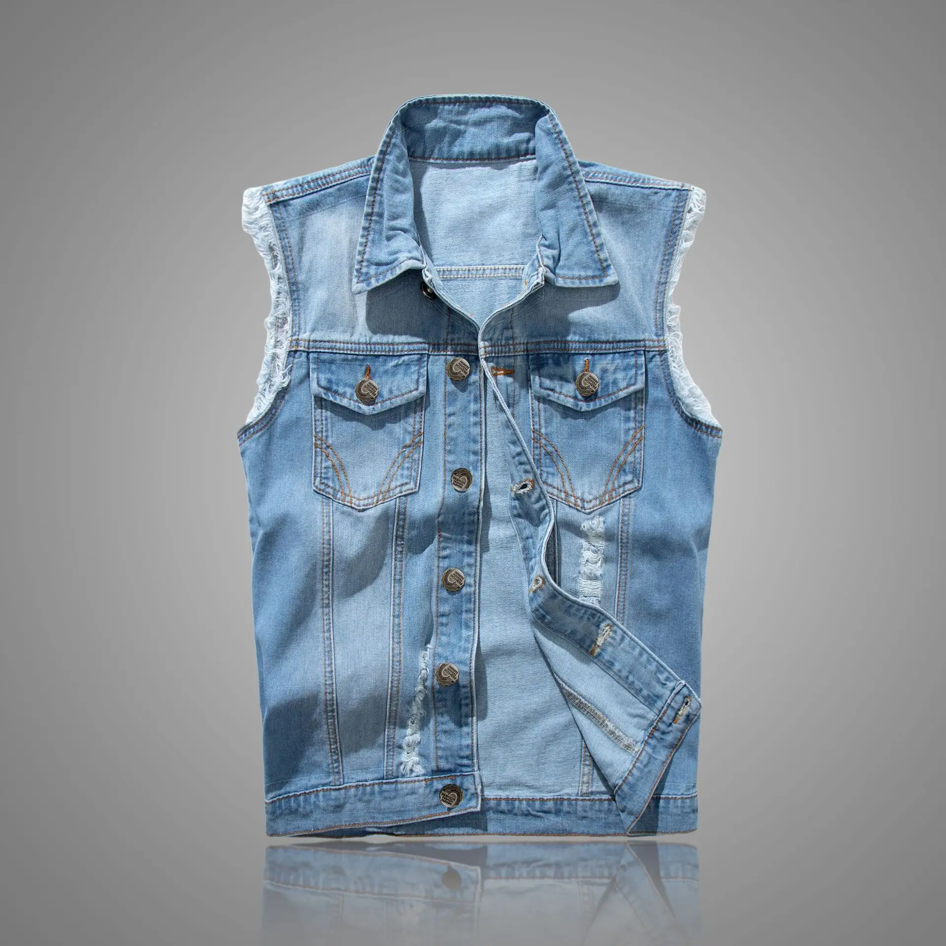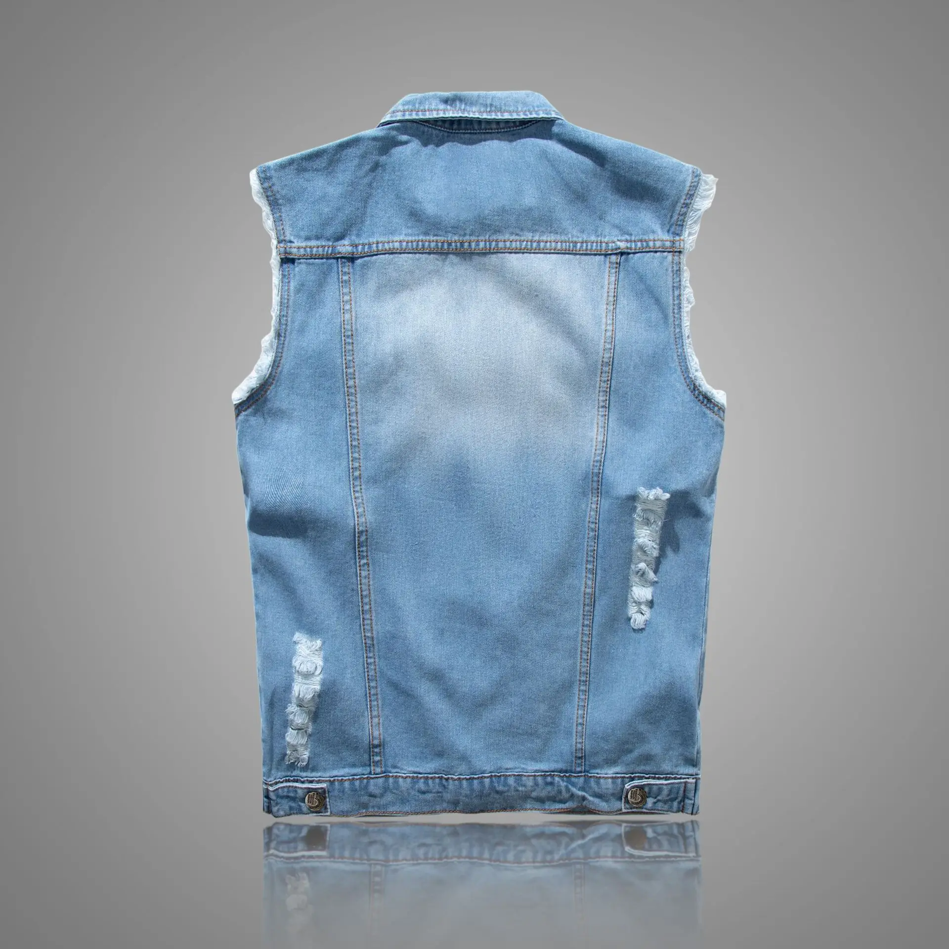 New Fashion Men Ripped Denim Waistcoats Sleeveless Jackets Light Blue Holes Denim Vests Male Cotton Slim Jeans Waistcoats 6XL